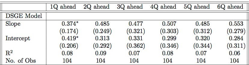 Forecast horizons are quarterly and we want to focus on the DSGE prediction (light blue) against the data (red). One quarter ahead, the model actually does a decent job (probably because of the persistence of growth over time), but its predictive power is quickly lost as we expand the horizon. The table below shows how poor this fit actually is.